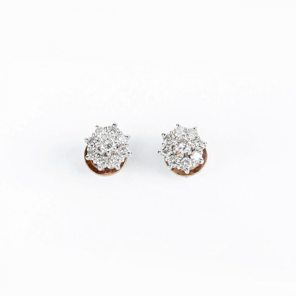 Pendientes rosetón en oro blanco con centro y orla de limpios y blancos diamantes, talla brillante, en garras.