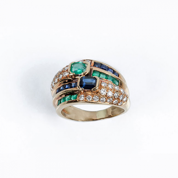 Sortija años 80, de alta joyería, en oro amarillo con una bella esmeralda en su talla, y un zafiro similar, flanqueados por bandas de esmeralditas y zafiritos calibrados y filas de limpios y blancos diamantes, talla brillante.