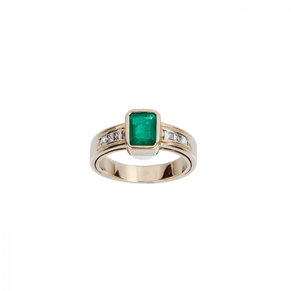 Sortija en sólida montura de oro amarillo con una bonita esmeralda en su talla, flanqueada de dos bandas de limpios y blancos diamantes, talla princesa.