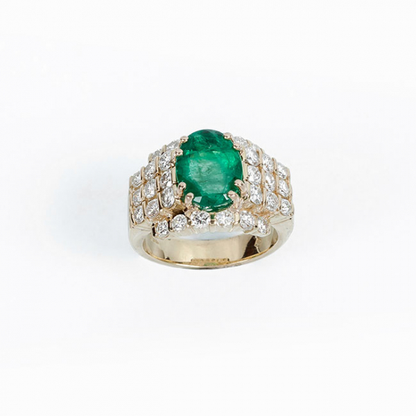 Sortija en sólida montura de oro amarillo con una bonita esmeralda, talla oval, sobre motivo cuajado de limpios y blancos brillantes en bandas.