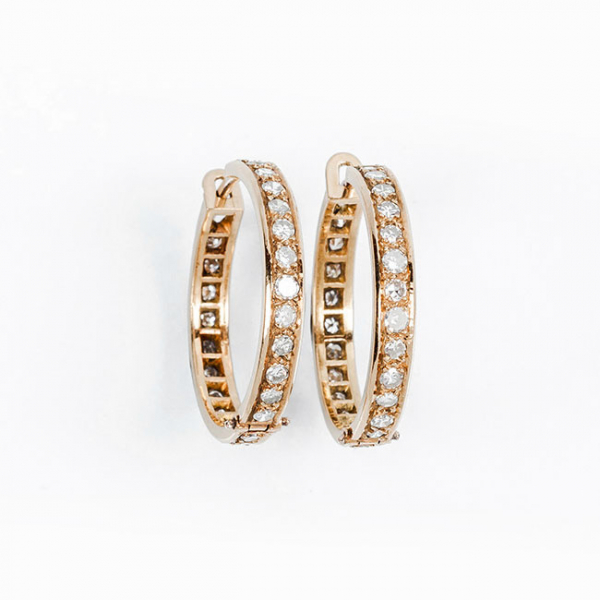 Pendientes criollas vintage en sólida montura de oro amarillo con fila exterior completa de limpios y blancos diamantes, talla 8/8.
