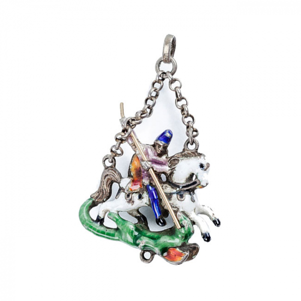 Brinco, ó pinjante de cadenas, realizado en plata, s XIX, en decoración esmaltada, con motivo de San Jorge y el dragón.