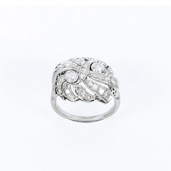 Sortija de época, art-decó, en platino, con motivo 'tú y yo' con dos limpios y blancos diamantes centrales, talla brillante y bandas curvadas, caladas, en fila de diamantes