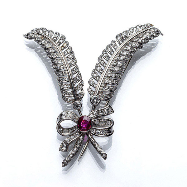 Original broche en forma de doble pluma con lazada, en montura de oro blanco cuajada de limpios y blancos diamantes talla 8/8 y dos centros de brillante en chatón y un bonito rubí natural de 2.00 ct aprox., talla oval, en el centro