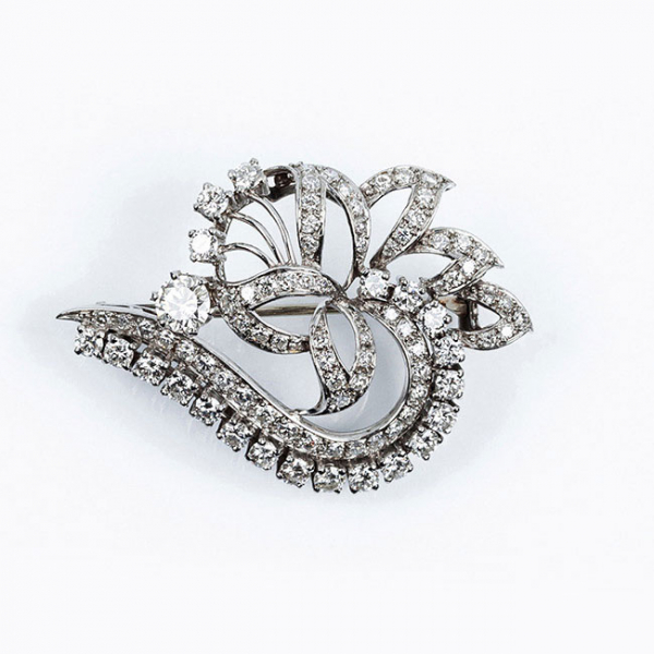 Alfiler-broche vintage en oro blanco, de excelente factura, en diseño floral con lazo, calado, cuajado de limpios y blancos diamantes, talla talla brillante moderna, destacando un brillante central en garras