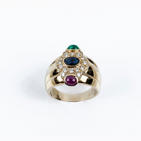 Sortija ancha en montura maciza de oro amarillo, con zafiro fino azul oval orlado de limpios y blancos diamantes, talla brillante y flanqueado de rubí y esmeralda cabuchón