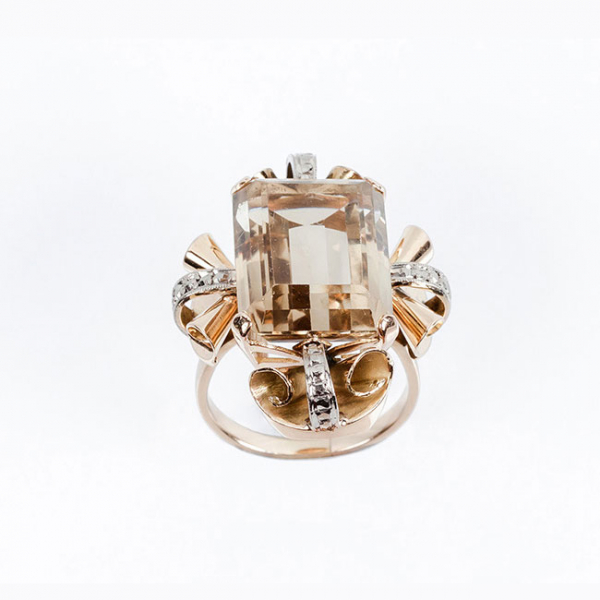 Sortija de época 'chevalier' en sólida montura de oro amarillo con un gran cuarzo 'fumé' en talla esmeralda orlado de volutas y detalles en oro blanco.