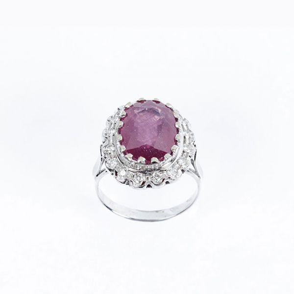 Sortija en oro blanco con un gran rubí, talla oval, en garritas, y orla lobulada, en fila de limpios y blancos diamantitos talla brillante