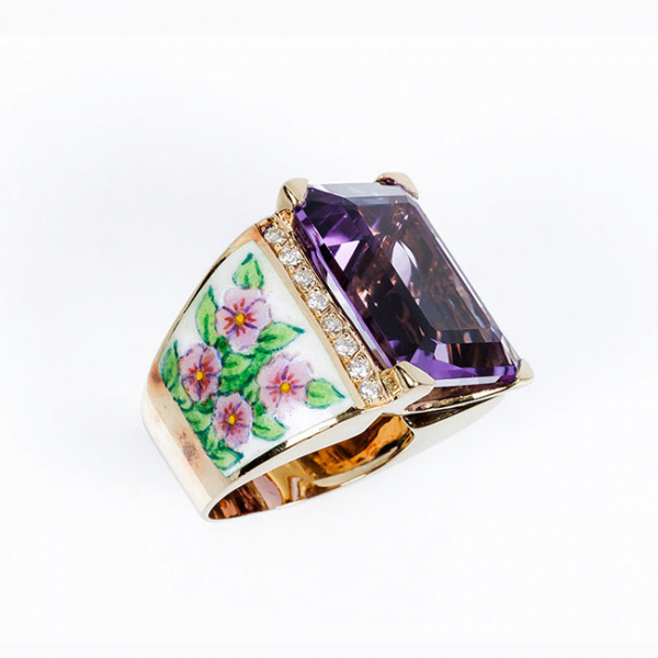 Gran sortija en sólida montura de oro amarillo, con amatista talla esmeralda, en cuatro fuertes garras, entre dos bandas en fila de diamantes talla brillante