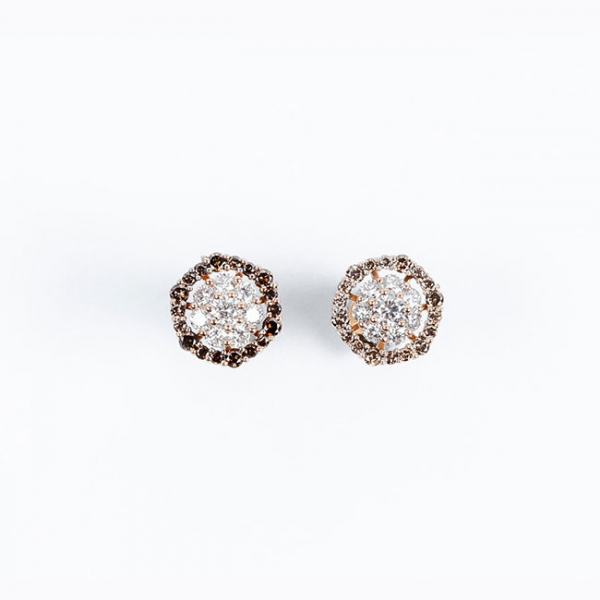 Pendientes botón en oro amarillo con centro en rosetón de limpios y blancos diamantes, talla brillante, y orla calada en fila de brillantes 'brown'