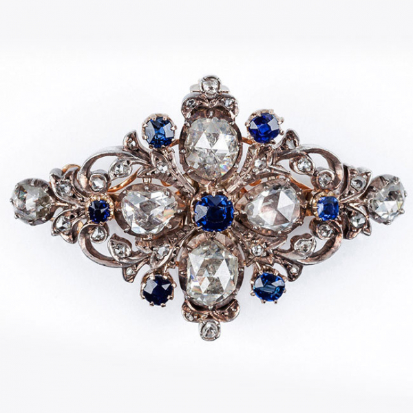 Bello alfiler-colgante s XIX (probablemente Rusia), en oro rosa, con planta de cruz, calada, con grandes diamantes talla rosa, en perilla, orlada de diamantitos y zafiros finos azules, y vistas de plata