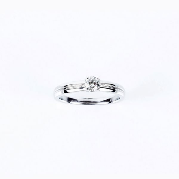 Anillo solitario en oro blanco, con un un limpio y blanco diamante talla brillante de 0.25 ct aprox, en garras
