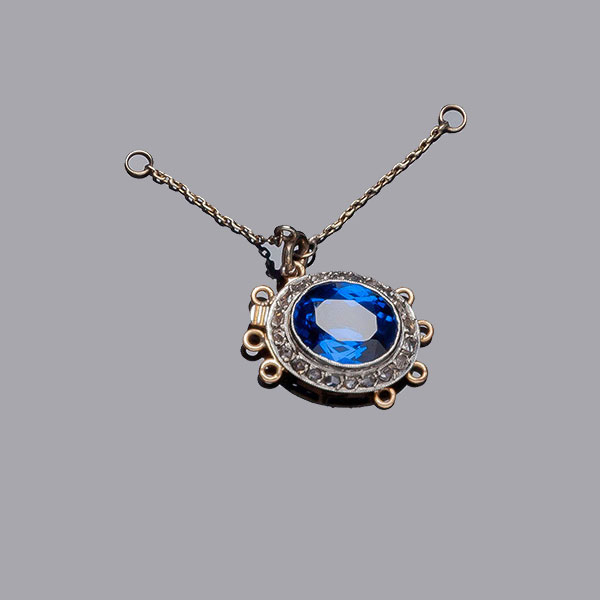 Cierre oval de collar (hasta 4 vueltas), vintage, en oro rosa y vistas de oro blanco, con piedra azul, talla oval, en chatón, orlada de diamantitos en decoración grafilada.