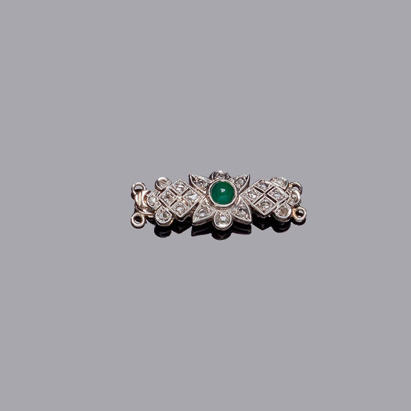 Cierre de pulsera o collar dos vueltas, vintage, en oro blanco, cuajado de diamantes, con centro de crisopás verde en cabujón, y vistas grafiladas.