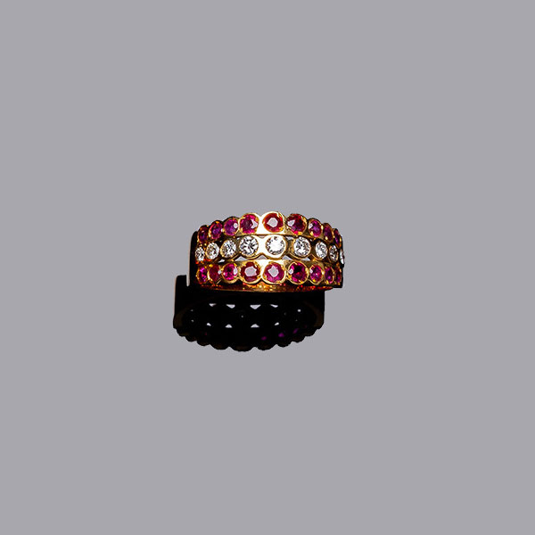 Sortija en oro amarillo, con fila central de limpios y blancos diamantes, talla brillante, en chatón, flanqueada por dos bandas de rubíes.