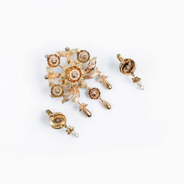 Conjunto de alfiler y pendientes antiguos, en oro rosa y amarillo, mate y brillo, decorados con perlitas y diamantitos, siguiendo composiciones vegetales, volutas y flecos colgantes con movimiento.