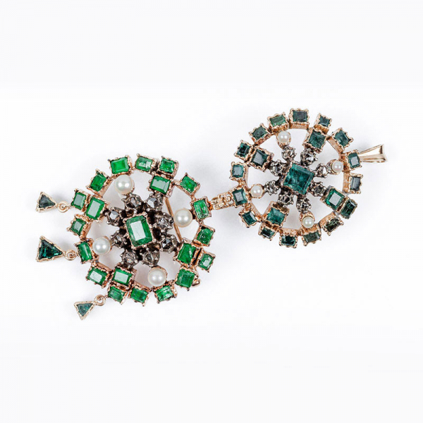 Conjunto desmontable de dos alfileres - colgantes, en rosetón calado cuajado de esmeraldas finas, con centro orlado de diamantes en vistas de plata, y perlitas