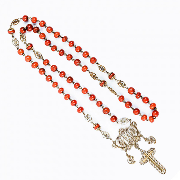 Collar realizado con rosario antiguo con cruz y eslabones calados, en oro amarillo y cuentas botón de coral rojo.