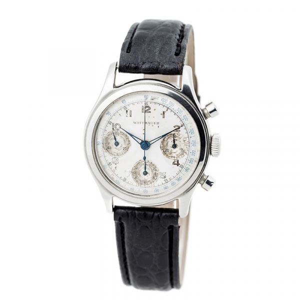 Reloj cronógrafo vintage, cab., suizo WITTNAUER Chronograph Valjoux 72, en caja original, 34 mm. Movimiento mecánico de carga manual, calibre 13 W, escape de áncora, rubíes.