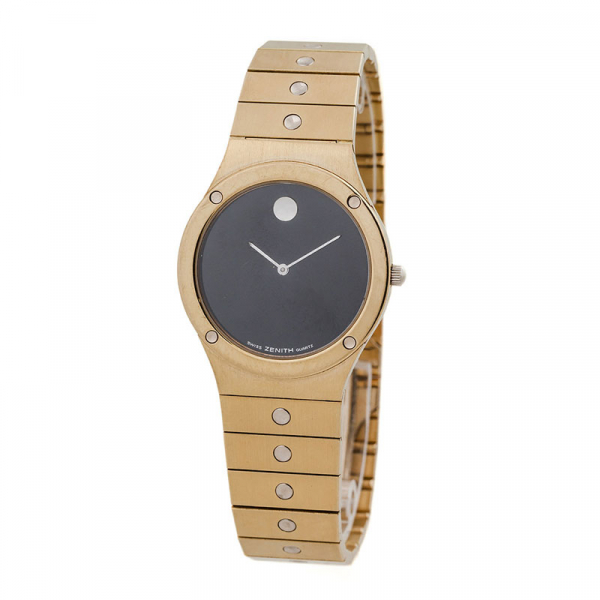 Esfera de aventurina negra con agujas plateadas. Excelente condición (1). Estado de marcha. [Zenith Museum es un modelo icónico de la marca. El Zenith Museum es reconocible por su diseño minimalista y su singular esfera sin marcas de hora, excepto por una sola a las 12 en punto. Fue uno de los primeros relojes de pulsera con movimiento de cuarzo en el mundo y se lanzó en la década de 1970].