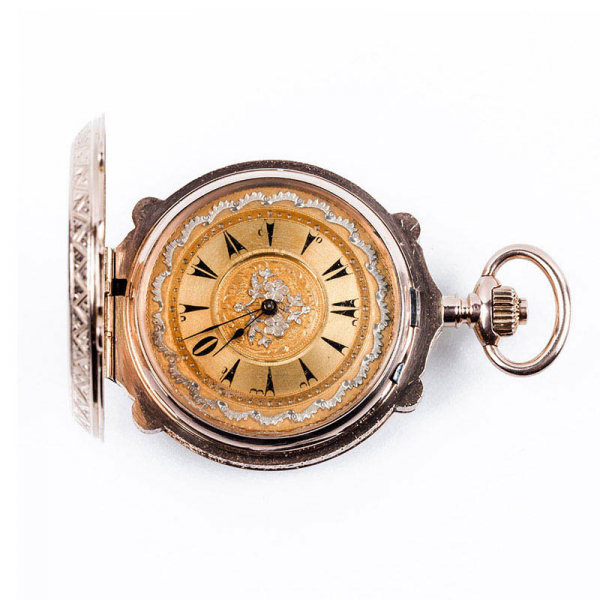 Excelente reloj saboneta, suizo, para el mercado turco, en sólida caja de oro rosa 14 K, de tres tapas, 50 mm con perfil ondulante, las exteriores en delicada decoración vegetal grabada de flores y roleos.