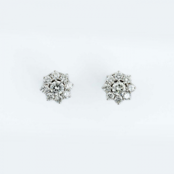 Elegantes pendientes vintage en oro blanco con rosetón de excepcionalmente limpios y blancos diamantes, talla brillante, en garritas, (2 bts: 0.80 ct y 16 bts: 1.00 ct aprox.