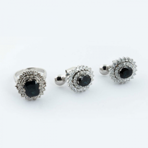 Los pendientes son de alta joyería, con limpios y blancos diamantes, talla brillante, (2 Zaf: 3.20 ct y 72 bts: 3.60 ct aprox. Características estimadas: color G, pureza VVS). 18 x 16 mm. Presiones de pala. La sortija tiene un zafiro de 3.50 ct aprox. (rayitas de uso superficiales), orlado de diamantes talla 8/8 (38 dts 8/8: 1.10 ct aprox. Características estimadas: color H, pureza VS). Nº de anillero: 16.