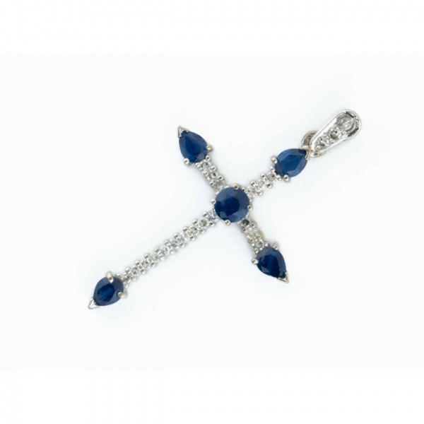 Bonita cruz colgante vintage en oro blanco, formada por filas de limpios y blancos diamantes, talla 8/8, y zafiros finos azules talla perilla y brillante