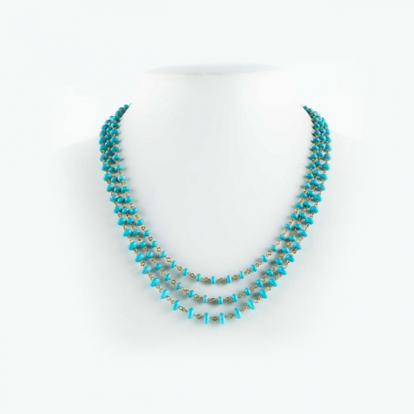 Delicada cadena extralarga en oro amarillo 18 K, con cuentas 'donut' de turquesitas naturales en ligera disminución.