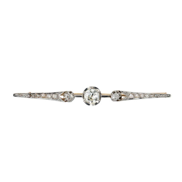 Barrita-alfiler antigua, en montura de oro amarillo 18 K y vistas de oro blanco, con un diamante talla brillante antigua, flanqueado de diamantes talla 'cojín', en garritas, y bandas de diamantitos simples sobre vistas grafiladas de platino u oro blanco