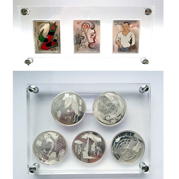 Lote: 1) Colección 'Los Cinco Sentidos' formada por 5 acuñaciones de plata fina 999 milésimas, en homenaje a Dalí. Edición de 'Colecciones Nobel' de 1992. Serie limitada de 1000 ejemplares (la presente es la nº 79). Se presentan en estuche desmontable de metacrilato, 17.5 x 13.0 cm. Se acompaña certificado-garantía, guía de interpretación y sobrecaja. 176.0 g neto. 2) Colección 'Sellos Joya' formada por 3 sellos de plata fina 999 milésimas, en homenaje a Dalí, Miró y Picasso, con motivos de sus obras en policromía esmaltada. Edición de 'Colecciones Nobel'. Serie limitada. Se presentan en expositor desmontable de metacrilato, 19.5 x 10.2 cm. Se acompaña de guía de interpretación y sobrecaja. 121.5 g neto.