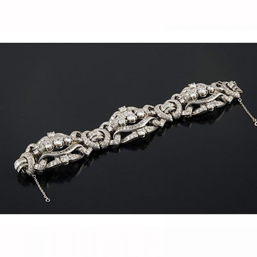 Fecha de fin 25/04/2017 a las 16:00:00 IMPORTANTE BRAZALETERealizado en platino, calada, con tres motivos ovalados formados por nueve diamantes centrales talla brillante, peso total aproximado: 6.60 ct. acompañados de diamantes tallas baguette, carré, brillante y 8/8, peso total aproximado: 29.40 ct. (Falta una piedra y un diamante suelto). Se acompaña de estuche original (deteriorado). Cierre con cadenita de seguridad. + INFO