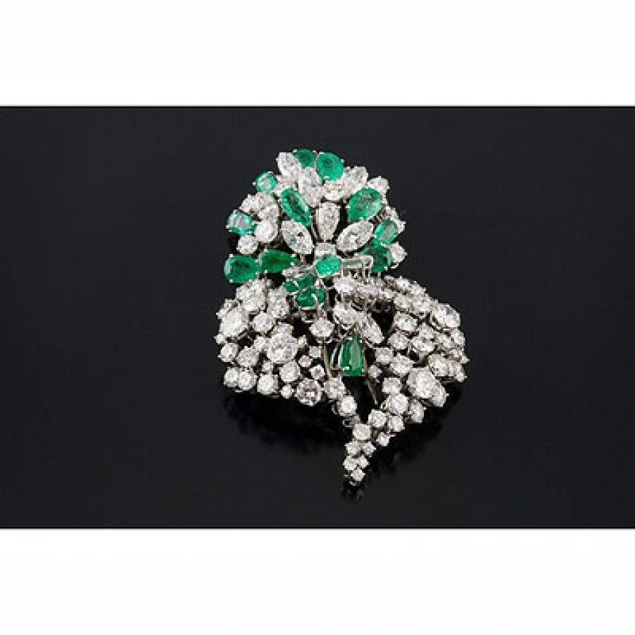 Fecha de fin 25/04/2017 a las 16:00:00 IMPRESIONANTE BROCHE Realizado en oro blanco, representando ramillete floral calado, compuesto por diamantes talla brillante, marquisse y perilla montados en garras a diferentes alturas, peso total aproximado: 27.97 ct., e intercaladas esmeraldas talla perilla, peso total aproximado: 9.75 ct. + INFO