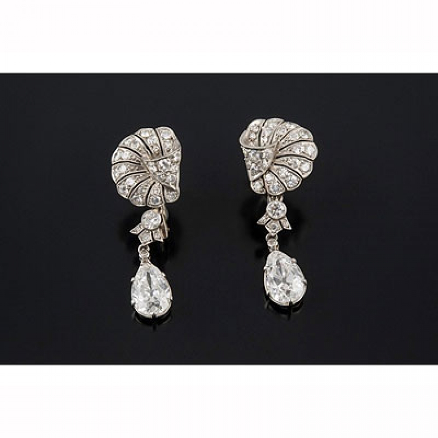Fecha de fin 25/04/2017 a las 16:00:00 PENDIENTES LARGOS Realizados en platino, cuerpo superior en forma de caracola cuajado de diamantes tallas brillante, brillante antigua y 8/8, peso total aproximado: 2.32 ct. de los que penden dos diamantes talla perilla antigua, peso total aproximado: 4.33 ct. + INFO