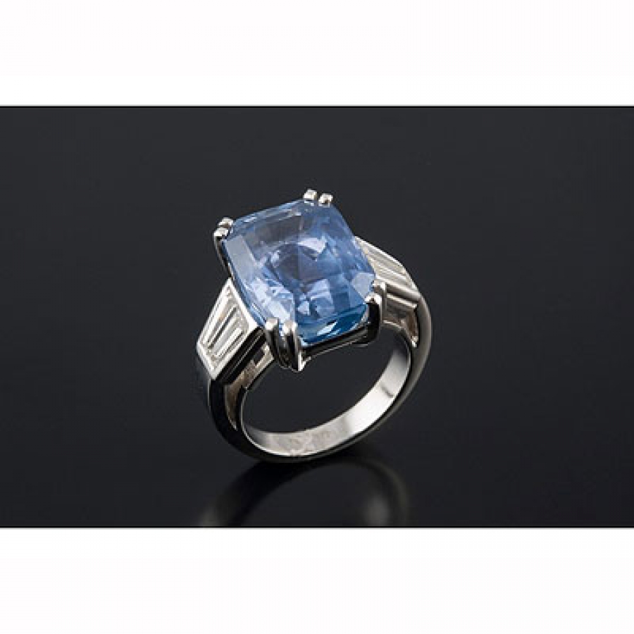 Fecha de fin 25/04/2017 a las 16:00:00 SORTIJA Realizada en oro blanco, formada por un zafiro Ceylan talla esmeralda, peso aproximado: 16.54 ct., acompañado por cuatro diamantes talla trapecio, peso total aproximado: 1.12 ct. + INFO