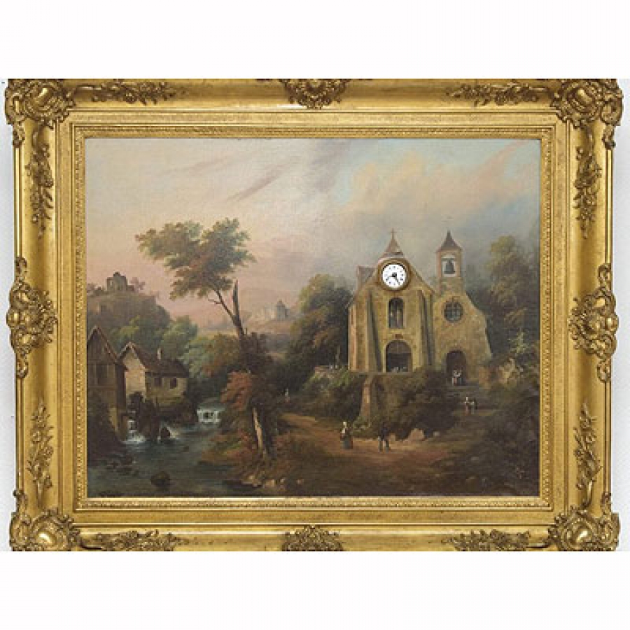 Fecha de fin 27/04/2017 a las 16:00:00 ESCUELA CENTROEUROPEA S. XIX - Paisaje de montaña con reloj Óleo sobre lienzo de 72 x 90 cm.Marco de época en madera estucada y dorada.Al interior, maquinaria del reloj y sonería, con caja de música. En funcionamiento.+INFO