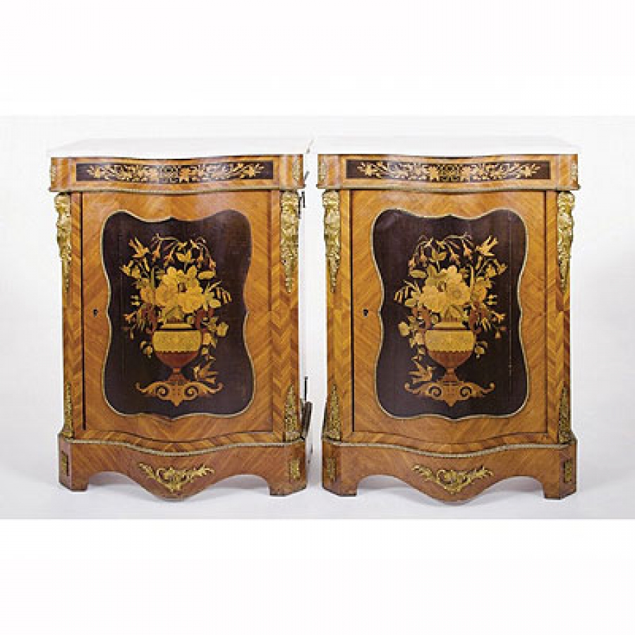 Fecha de fin 27/04/2017 a las 16:00:00 PAREJA DE ENTREDOSES NAPOLEÓN III, SIGLO XIX En nogal con motivos de jarrones florales en marquetería. Frente de perfil curvo con puerta frontal, molduras y aplicaciones en bronce dorado. Tapa en mármol blanco.Medidas: 102 x 36 x 71 cm.Ligeros deterioros. + INFO