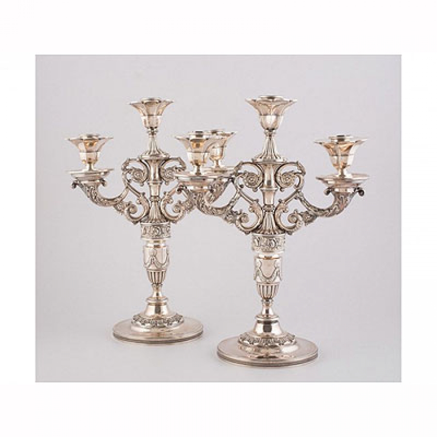 Fecha de fin 27/04/2017 a las 16:00:00 CANDELABROS REAL FÁBRICA DE PLATERÍA MARTÍNEZ Realizado en plata en su color de tres luces. Base decorada con motivos vegetales, fuste tipo ánfora con guirnaldas y motivos florales, brazos con tornapuntas y palmetas con mecheros centrales. (Restaurados). Marcas: Madrid Villa 58 y Corte 58. Firma: MARTINEZ. Altura: 33 cm. (aproximadamente).+ INFO