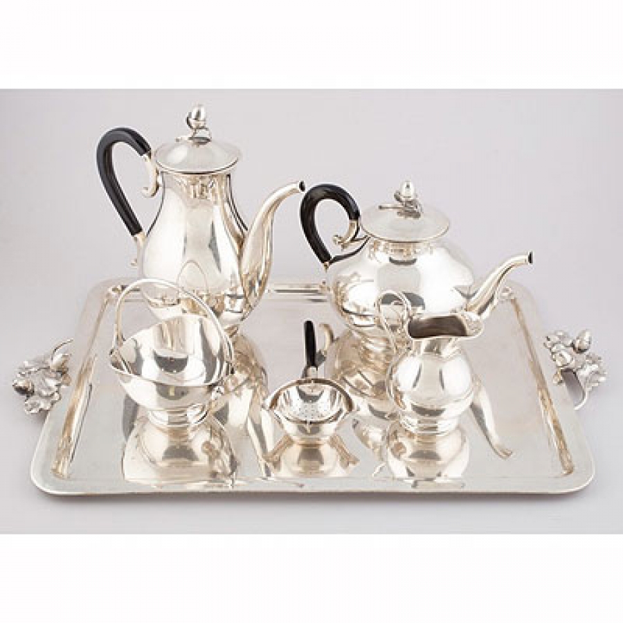 Fecha de fin 27/04/2017 a las 16:00:00 JUEGO DE CAFÉ Y TÉ (BELLOTAS)Realizado en plata en su color, decoración con motivos vegetales y apliques negros.