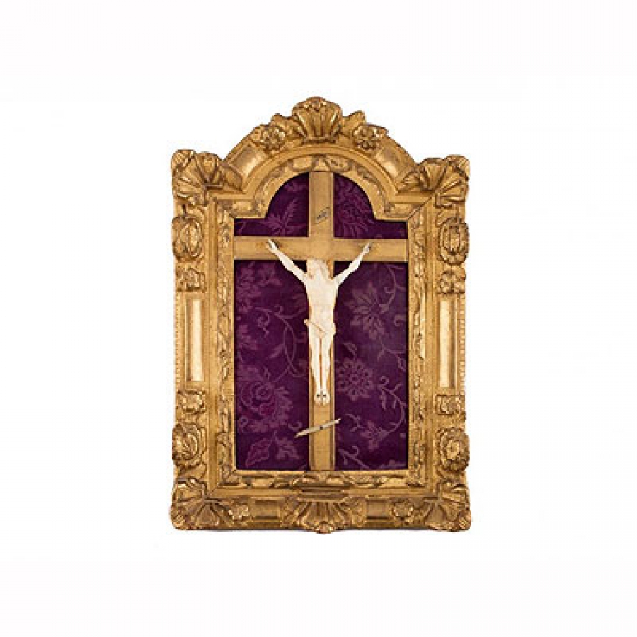 Fecha de fin 27/04/2017 a las 16:00:00 CRISTO CRUCIFICADO Realizado en marfil tallado a mano, de cuatro clavos, en marco de madera dorada con palmetas y flores sobre textil morado. Medidas: 46 x 32 cm. Se adjunta fotocopia de Certificado de garantía de la Federación Española de Anticuarios según el cual se trata de marfil de elefante. + INFO