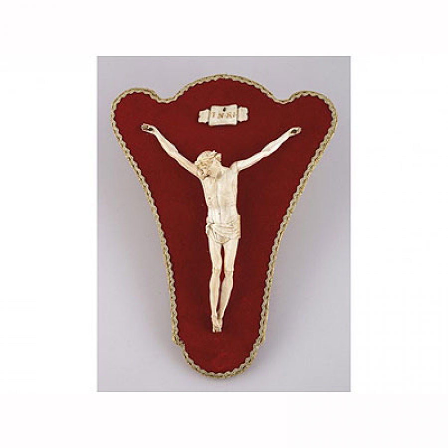 Fecha de fin 27/04/2017 a las 16:00:00 CRISTO CRUCIFICADO S. XIX Realizado en marfil tallado, de tres clavos en soporte de madera de contorno lobulado sobre textil rojo. Medidas: 26 x 20 cm. Se adjunta fotocopia de Certificado de antigüedad según el cual se trata de marfil, realizado en el S. XIX + INFO