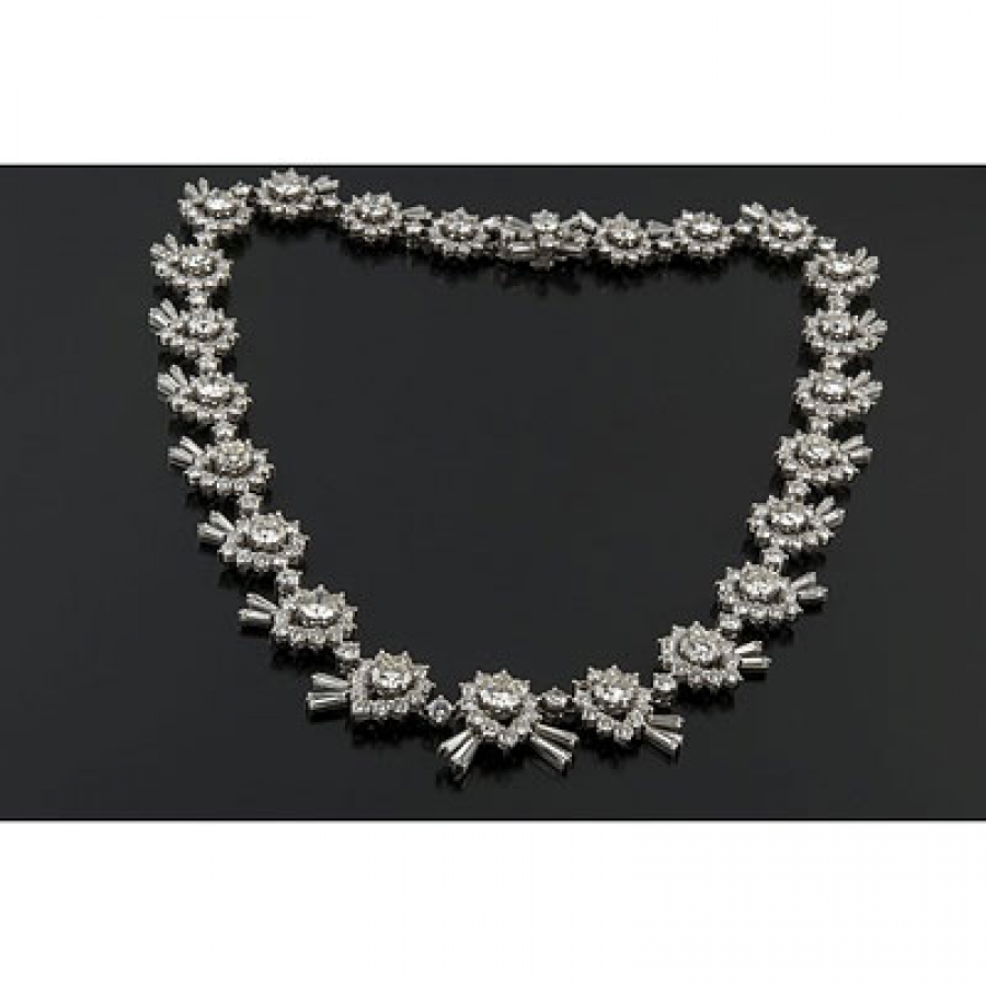 GARGANTILLA Realizada en oro blanco, formada por veintitrés centros de diamantes talla brillante, peso total aproximado: 20.42 ct., orlados por diamantes talla brillante, baguette y trapecio, peso total aproximado: 28.43 ct. (Falta una piedra).