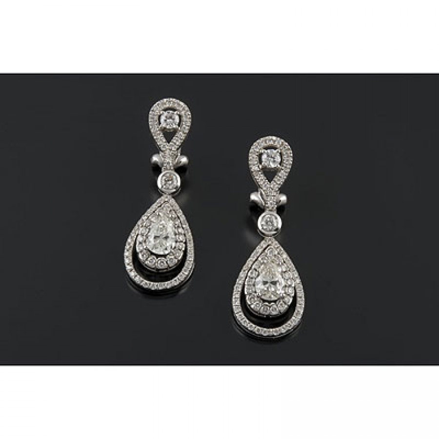 PENDIENTES Realizados en oro blanco, parte superior formada por dos diamantes talla brillante con orla aperillada de diamantes y parte inferior compuesta por dos diamantes talla perilla, peso total aproximado: 2.04 ct. y doble orla de diamantes talla brillante. Peso total aproximado de todos los brillantes: 2.08 ct. +INFO
