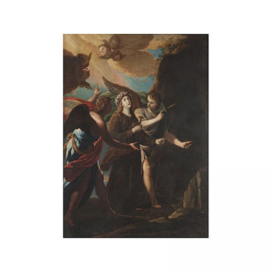 ACISCLO ANTONIO PALOMINO (Bujalance, Cordoba 1653-1726) - Santa Rosalia de Palermo Óleo sobre lienzo de 167 x 121 cm. Santa Rosalía fue una joven perteneciente a la nobleza siciliana que vivió en elsiglo XII haciendo penitencia en una cueva en el monte Pellegrino, cerca de Palermo. La devoción por esta santa había ido decayendo a lo largo de la Edad Media, pero el hallazgo de sus restos en 1624, momento en que la peste asolaba la ciudad de Palermo, hizo resurgir su popularidad, ya que se atribuyó a su intercesión la remisión de la epidemia. Paralelamente surgió un renovado interés por la plasmación de su imagen y, al tratarse de una eremita, su representación más habitual se acomodó a los modelos de Maria Magdalena. No son muy numerosas las versiones que se conocen del episodio de la vida de Santa Rosalía representado en esta pintura; se trata del momento en que la joven palermitana se dirige a la citadacueva del monte Pellegrino para llevar en ella una vida de penitencia y oración. Vestida con una túnica marrón y calzada con sandalias, va acompañada por dos ángeles mancebos, quesegún algunos autores fueron San Rafael y su Angel de la Guarda; en la mano izquierda lleva un rústico bastón y con la derecha sostiene un crucifijo y un pequeño fardo que aprietacontra su seno, tal como dicen sus hagiógrafos que partió de la casa paterna para iniciar una vida de eremita. Aunque este lienzo no está firmado, se puede atribuir a Acisclo Antonio Palomino, pintor nacido en Bujalance (Córdoba) pero trasladado en su juventud a la Corte madrileña, donde su estilo fue recibiendo sucesivas influencias de Carreño, Claudio Coello y Luca Giordano, estilo que prolongó hasta bien entrado el siglo XVIII, aunque su paleta, por la práctica de la pintura al fresco, en la que fue un consumado artífice, se fue aclarando hacia unos tonos más nacarados, que preludian lo que será el estilo rococó. Tanto la manera de construir el paisaje como las las lejanías con celajes arrebolados, recuerdan dos de sus obras firmadas: Las alegorías del Aire y el Fuego que, procedentes de la colección Real, se conservan en elMuseo Nacional del Prado. Es también característico de su pincel el grupo de querubines del ángulo superior izquierdo,cuyos modelos pueden encontrarse en las numerosas versiones de la Inmaculada Concepción que realizó. En cuanto a la efigie de Santa Rosalía, parece probable que Palomino tuviera en cuenta la representación que de esta santa había realizado Luca Giordano en torno a 1697, momento en que el napolitano se encontraba en España y con quien Palomino había tenido contacto directo. Sin embargo, hay que destacar un cierto amaneramiento en las figuras de los ángeles adolescentes, amaneramiento que se puede observar en sus obras en sus obras más tardías y que puede ser debido, bien a su edad avanzada, bien a la participación de su hijo Francisco (Madrid, 1685- Madrid, 1726), de cuya actividad junto a su padre se tienen noticias documentales desde 1705. Con independencia de los rasgos estilísticos que llevan a considerar esta pintura como de Antonio Palomino y a situarla en su etapa avanzada de su producción, existen otras razones que apoyan esta atribución. En primer lugar en 1726 el P. Luis Ignacio Zevallos publicó el libro: "Vida y virtudes de la Venerable Madre Juana de la Encarnación" en el que se contienen una serie de ilustraciones grabadas por su sobrino Juan Bernabé Palomino ( Córdoba , 1692- Madrid, 1777) , una de las cuales repite idéntica composicion. +INFO