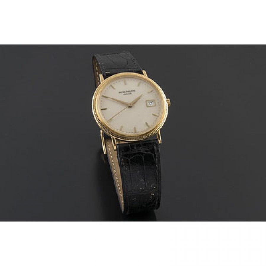 RELOJ PATEK PHILIPPE CALATRAVA Realizado en oro para caballero. Caja redonda, bisel reticulado. Funciones: horarias, minuteras, segunderas y calendario. Esfera color marfil satinado, numeración baquetonada, agujas tipo dauphine y ventana para calendario a las 3h. Movimiento de cuarzo. Brazalete original de piel de color negro y hebilla de oro. Ref: 3944. Nº 1.551.758. Se acompaña de estuche y documentación. +INFO