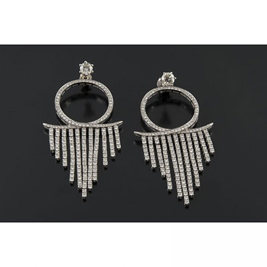 PENDIENTES LARGOS Desmontables, parte superior compuesta por dos diamantes talla brillante, peso total aproximado: 1.24 ct., y parte inferior formada por looping rematado en flecos cuajados por diamantes talla brillante, peso total aproximado: 6.01 ct. +INFO