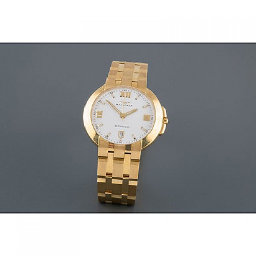 RELOJ SANDOZ BORNEO Realizado en oro para caballero. Caja redonda, bisel liso. Funciones: horarias, minuteras, segunderas y calendario. Esfera color blanco, numeración romana, agujas tipo bastón y ventana para calendario a las 6 h. Movimiento de cuarzo. Brazalete original realizado en oro. Nº 2281674 01234.Se acompaña de estuche original.