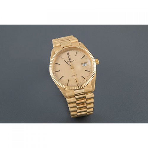 RELOJ CYMARealizado en oro para caballero. Caja redonda, bisel estriado. Funciones: horarias, minuteras, segunderas y calendario. Esfera dorada, numeración baquetonada, agujas tipo bastón y ventana con lupa para calendario a las 3 h. Movimiento de cuarzo. Brazalete realizado en oro con cierre desplegable oculto. nº 2820599.