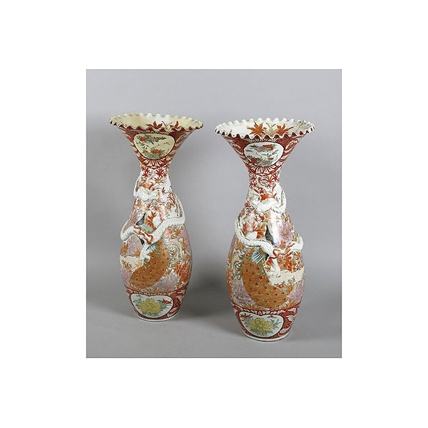 Con profusa decoracion Imari policromada con motivos de pavos reales y peonías. Grandes dragones en relieve, en vidriado blanco y parcialmente dorados, recorren el cuerpo globular. Boca exvasada y lobulada. Restauraciones en el cuello y boca. Altura: 77 cm. PUJAR AQUÍ