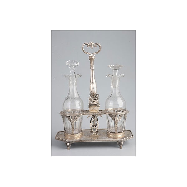 Con marcas de la plateria madrileña y punzones del platero Vicente Perate. Bandeja octogonal con borde decorado con greca grabada de uvas y roleos vegetales, sobre pies en forma de cabezas de felino alado. Los depósitos de las vinagreras están decorados con esfinges aladas cinceladas y grecas de palmetas grabadas. Asa abalaustrada con doble apoyo en forma de lira y remate de roleos y mascarón. Vinagreras en cristal tallado francesas con tapón repuesto. Medidas: 35 x 14 x 26 cm. Peso: 1.207 grs. PUJAR AQUÍ